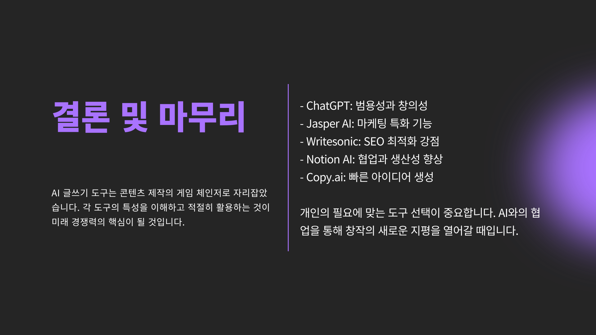 이제는 '글을 잘 쓰는 사람'보다 'AI를 잘 활용하는 사람'이 주목받는 시대입니다. 콘텐츠가 필요한 순간마다 나만의 조력자를 곁에 둘 수 있다면, 작업 속도도 퀄리티도 완전히 달라지겠죠. 오늘 소개한 TOP 5 AI 도구들을 직접 사용해보며 나에게 맞는 툴을 골라보세요. 시대가 바뀌었으니, 글쓰기도 달라져야 할 때입니다. 이제 여러분도 AI와 함께 창작의 영역을 확장해보세요. 미래는 이미 우리 손 안에 있습니다!
